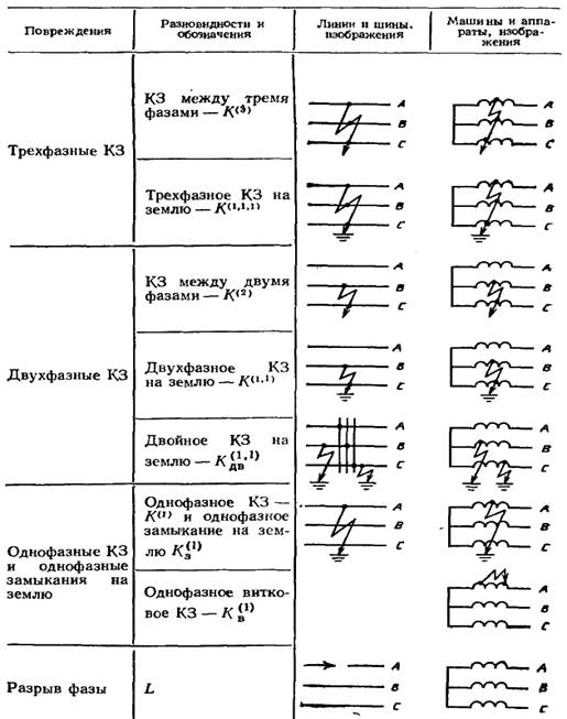Повреждения в электрических системах чаще возникают на линиях сетей. Повреждения в обмотках электрических машин, и особенно таких аппаратов, как трансформаторы и автотрансформаторы, бывают реже, иногда имеют специфический характер, обусловленный их выполнением (например, витковые КЗ), и могут сопровождаться тяжелыми для них последствиями. Основные виды повреждений приведены в табл. 1. Возможны и более сложные виды повреждений, представляющие сочетание некоторых из перечисленных.