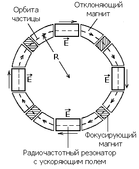 Синхротрон – кольцевой циклический ускоритель заряженных частиц, в котором частицы двигаются по орбите неизменного радиуса за счёт того, что темп нарастания их энергии в ускоряющих промежутках синхронизован со скоростью нарастания магнитного поля на орбите. Он позволяет ускорять как лёгкие заряженные частицы (электроны, позитроны), так и тяжёлые (протоны, антипротоны, ионы) до самых больших энергий. В настоящее время все циклические ускорители на максимальные энергии – это ускорители синхротронного тип (их принцип предложен в 1944 г. В. Векслером (СССР) и независимо в 1945 г. Э. Макмилланом (США).