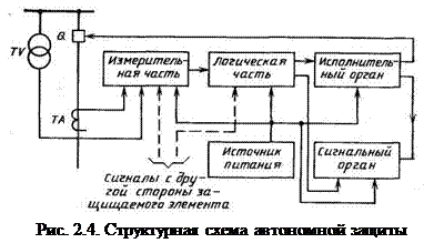 Структурная схема релейной защиты Способы выполнения защит весьма разнообразны. Однако все оин обычно строятся на электрических принципах, выполняются в большинстве случаев автономными устройствами и имеют в общем случае две главные части (рис. 2.4) – измерительную н логическую. Измерительная часть, включающая измерительные органы, непрерывно контролирует состояние защищаемого объекта и определяет условия срабатывания в соответствии со значениями входных воздействующих величин. Логическая часть, включающая логические органы, формирует управляющие воздействия в зависимости от комбинации и последовательности поступления на нее сигналов от измерительной части. Обычно логическая часть действует на выключатели не непосредственно, а через исполнительный орган. Измерительная часть, как правило, получает информацию о токах и напряжениях в месте включения защиты через. первичные измерительные преобразователи – трансформаторы тока и напряжения (ТА и TV).