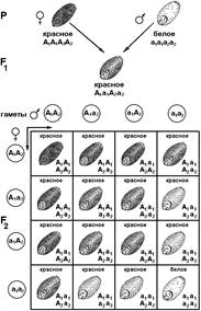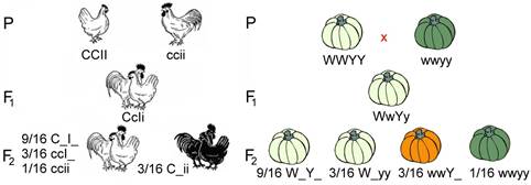 Примером комплементарности является наследование дисковидной формы плодов тыквы (рис. 415). Наличие в генотипе доминантных генов А или В обусловливает округлую форму плодов, а рецессивных – удлинённую. При наличии в генотипе одновременно доминантных генов А и В форма плода будет дисковидной. При скрещивании чистых линий с сортами, имеющими округлую форму плодов, в первом гибридном поколении F1 все плоды будут иметь дисковидную форму, а в поколении F2 произойдёт расщепление по фенотипу: из каждых 16 растений 9 будут иметь дисковидные плоды, 6 – округлые и 1 – удлинённые, расщепление 9:6:1. Классическим примером комплементарного взаимодействия генов является наследование формы гребня у кур. При скрещивании кур, имеющих розовидный и гороховидный гребень, все первое поколение имеет ореховидный гребень. При скрещивании гибридов первого поколения у потомков наблюдается расщепление по форме гребня: 9 ореховидных: 3 розовидных: 3 гороховидных: 1 листовидный. Генетический анализ показал, что куры с розовидным гребнем имеют генотип А_bb, с гороховидным – ааВ_, с ореховидным – А_В_ и с листовидным – ааbb, то есть развитие розовидного гребня происходит в том случае, если в генотипе имеется только один доминантный ген – А, гороховидного – наличие только гена В, сочетание генов А В обусловливает появление ореховидного гребня, а сочетание рецессивных аллелей этих генов – листовидного. Расщепление 9:3:3:1. У душистого горошка ген С обуславливает синтез бесцветного предшественника пигмента – пропигмента, если аллель с – пропигмент не образуется. Ген Р определяет синтез фермента, под действием которого пропигмент превращается в пурпурный пигмент. Если аллель p – фермент не синтезируется. При скрещивании двух сортов с белыми цветами (ССрр и ссРР) все F1 (СсРр) имеет пурпурные цветы. При скрещивании гибридов в F2 расщепление 9:7, пурпурные цветы будут у растений с генотипом С_Р_. Эпистаз. Эпистатичным называют такое взаимодействие генов, при котором аллель одного гена подавляет действие аллелей других генов. Эпистатичное взаимодействие противоположно комплементарному. Некоторые породы кур имеют белое оперение, другие же – окрашенное. Белое оперение определяется несколькими различными генами, например, у белых леггорнов – генами ССII, а у белых плимутроков – ccii (рис. 416). Доминантная аллель гена С определяет синтез предшественника пигмента (хромогена, обеспечивающего окраску пера), а его рецессивная аллель с – отсутствие хромогена. Ген I является подавителем действия гена С, а аллель i не подавляет его действия. При скрещивании, например, леггорнов (ССII) с плимутроками (ссii), все потомство F1 имеет белую окраску, которая определяется наличием в их генотипе гена-подавителя (СсIi). Если же гибридов F1 скрестить между собой, то во втором поколении происходит расщепление по окраске в отношении 13/16 белых: 3/16 окрашенных. Окрашенным оказывается та часть потомства, в генотипе которой имеется ген окраски и отсутствует его подавитель (С_ii). Другой пример. Ген W обуславливает белый цвет плодов тыквы, причем при его наличии ген Y не проявляется. При генотипе wwYY или wwYy плоды имеют желтый цвет. Наконец, если оба гена рецессивны, то плоды зеленые. Во втором поколении 9/16 будут иметь генотип W_Y_ и белую окраску, 3/16 с генотипом W_yy – белую окраску плодов, 3/16 с генотипом wwY_ – желтые пл