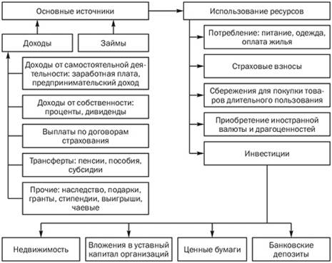 Любые финансовые решения домашних хозяйств принимаются прежде всего в отношении использования денежных фондов. С точки зрения материального состава финансы домашнего хозяйства — это совокупность созданных ими целевых денежных фондов, другими словами, это общий объем финансовых ресурсов, которыми располагает домашнее хозяйство (рис. 3). В структуру финансовых ресурсов домашнего хозяйства входят: - денежные средства, предназначенные для текущих расходов — расходов на приобретение продуктов питания, непродовольственных товаров, используемых в течение относительно непродолжительного периода времени (обувь, одежда и т.п.), плата за периодически потребляемые услуги и др.; - денежные средства, предназначенные для капитальных расходов — приобретения непродовольственных товаров, используемых в течение достаточно длительных промежутков времени (мебель, жилье, транспортные средства и т.д.), оплаты услуг, достаточно редко потребляемых участниками домашнего хозяйства (образование, медицинская операция, туристические путевки); - денежные сбережения; - денежные средства, вложенные в движимое и недвижимое имущество. Как правило, домашнее хозяйство начинает свою хозяйственную деятельность, обладая некоторым первоначальным накопленным ранее богатством, которое переходит к нему по наследству, а иногда в результате дарения. Это богатство может быть представлено в разных формах, прежде всего в форме недвижимости, наличных денег, а в некоторых случаях — в форме ценных бумаг. Помимо первоначальных ресурсов их источниками являются: - располагаемый доход домашнего хозяйства; - потребительский кредит; - социальные трансферты; - прочие ресурсы (например, это могут быть выигрыши в лотерею, доходы от персональных займов другим физическим лицам). Как и в организации бизнеса, структура портфеля активов во многом зависит от склонности к риску. Если члены домашнего хозяйства как инвесторы имеют высокую склонность к риску, то может быть принято решение о том, что значительную долю портфеля должны составлять ценные бумаги. Экономические и финансовые решения в домашнем хозяйстве зависят от многих факторов, среди которых основными являются: - текущие и перспективные цели; - отношения между членами домашнего хозяйства; - уровень доходов домашнего хозяйства; - предпочтения и склонность к риску членов домашнего хозяйства; - внешняя среда, в которой действует домашнее хозяйство.