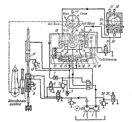 Для снижения шероховатости поверхностей деталей в технологических процессах применяют хонингование, притирку и суперфиниширование. Хонингование в основном применяется при обработке цилиндрических отверстий. Сущность этого процесса состоит в том, что специальный инструмент (хонинговальная головка), оснащенный абразивными брусками, совершает одновременно вращательное и возвратно-поступательное движения в неподвижной детали. Абразивные бруски 4 (рис. 80) устанавливаются в пазах боковой поверхности головки и получают автоматическое радиальное перемещение при помощи конусов 2 и 5, насаженных на стержень 3 с резьбой. Стержень после каждого двойного хода инструмента поворачивается и сближает конусы, которые через пальцы 1 раздвигают абразивные бруски. Благодаря применению брусков тонкой зернистости и сложном характеру их движения относительно обрабатываемой поверхности хонингование дает возможность не только снижать шероховатость поверхности, но и устранять небольшие неточности формы отверстий (конусность, овальность и пр.). При хонинговании применяется охлаждающая жидкость — керосин или водно-мыльные растворы. Хонинговальный станок ЗМ83 предназначен для обработки цилиндрических отверстий в условиях единичного и мелкосерийного производства (рис. 81). Станок работает по полуавтоматическому циклу. Техническая характеристика станка: частота вращения шпинделя 155 — 450 об/мин, мощность 10 кВт. пределы диаметров обрабатываемых деталей 67 — 145 мм, длина хода 150 — 450 мм. Шпиндель станка получает главное вращательное движение от электродвигателя через коробку скоростей (на схеме не показана). Гидроаппаратура станка обеспечивает полный цикл его работы, который происходит в следующем порядке. При включении гидронасосов 1 и 2 масло от насоса 1 большей подачи поступает к гидропанели, но так как электромагнит золотника 35 отключен, то масло через клапан 36 уходит на слив. От насоса 2 меньшей подачи масло поступает в нижнюю полость цилиндра 9 разжима брусков хона. При пуске станка включается электромагнит золотника 35, электромагнит распредели геля 32 и электромагнит 39 муфты счетчика двойных ходов (на схеме не показана). Золотник 35 отсекает уравновешивающую камеру клапана 36 от слива. Давление в системе возрастает. Распределитель 32 отсекает камеру 21 от слива. Масло от насоса поступает в камеру 12 гидропанели. Из камеры 12 масло подводится к камерам 19 и 21 и далее через обратный клапан 18 поступает под правый торец золотника 17, перемещая его в крайнее левое положение. После этого масло из камеры 12 будет поступать в камеру 14 и далее в верхнюю полость цилиндра 11 главного движения. Шпиндельная головка совершает медленный ход вниз.
