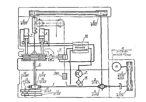 Рис. 83. Кинематическая схема станка мод. 3816 Универсально-притирочный станок 3816 (рис. 83) предназначен для притирки шеек коленчатых валов, концевых мер, пробок-калибров и др. От электродвигателя 11 через клиноременную передачу 1—2, червячную пару 3 — 4, клиноременную передачу 5 — 6 движение передается верхнему притиру. Нижний притир вращается от вала I через червячную передачу 9-1 и зубчатые колеса 15 — 12 — 13 — 14. Верхний притир подводится к обрабатываемым деталям и прижимается к ним при помощи гидроцилиндров 7 – 8, работающих от лопастного насоса 17.