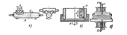 Рис. 84. Схемы суперфиниширования: а – цилиндрическое наружное; б – цилиндрическое внутреннее; в – плоское; А – возвратно-поступательное движение инструмента; Б – колебательное движение инструмента; В – вращение детали; Г – вращение инструмента; Д – колебательное движение детали.