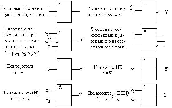Заметим, что, если при потенциальной форме соответствующая сигналу информация (лог.1 либо лог.0) может быть определена практически в любой момент времени, то при импульсной форме соответствие между уровнем напряжения и значением логической величины устанавливается в определенные дискретные моменты времени (так называемые тактовые моменты времени), обозначенные на рис.2.1,в целыми числами t = 0, 1, 2,... Общие обозначения логических элементов.