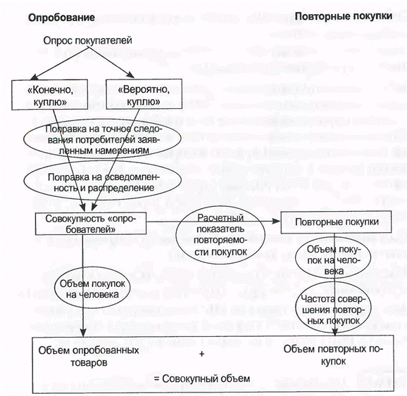Исходя из полученных результатов, компания оценивает интенсивность опробования нового степлера, накладывая поправку, принятую для данной отрасли, где принято считать, что в действительности совершат покупку 80% тех, кто ответил «конечно, куплю», и 30%, ответивших «вероятно» (при условии, что им будет предоставлена такая возможность).