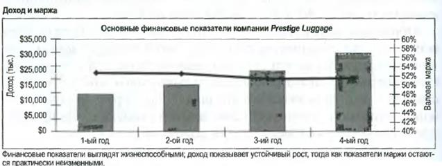В течение последних нескольких лет представление показателей в виде «приборных панелей» управления привлекает к себе достаточно большое внимание. Основная идея, по-видимому, заключается в том, что способ представления сложных данных может повлиять на способность руководства выявлять ключевые схемы и тенденции. Облегчит ли панель управления, то есть графическое представление той же самой информации, труд маркетологов по выявлению угрожающих тенденций? Метафорический образ приборной панели автомобиля абсолютно уместен, поскольку имеются множество показателей, которые могут быть использованы для оценки работы автомобиля. Приборная панель должна предоставить сокращенный набор важнейших показателей в форме, которая облегчает операторам их интерпретацию и использование. К сожалению, тогда как все автомобили имеют одинаковый набор ключевых показателей, это не применимо ко всем сферам экономической деятельности. Набор необходимых и критически важных показателей варьируется в зависимости от типа хозяйственной деятельности. На рис. 11.1 представлена «приборная панель» пяти важнейших показателей в динамике по времени. Компания показывает устойчивый рост продаж, сохраняя при этом показатели маржи на приемлемом уровне, хотя и продавая менее дорогие виды товара. Однако вызывает беспокойство тот факт, что доходы розничных торговцев (GMROII) стремительно падают по мере роста товарных запасов в магазинах. Подобным же образом сократился объем продаж в расчете на один магазин. Надбавка к цене, которой компания Prestige Luggage может управлять, уменьшилась, и все больше продаж компании осуществлялось по сделкам. Эта картина должна послужить для компании предостережением и вызвать обеспокоенность в отношении ее способности сохранить систему сбыта.