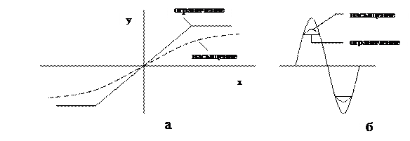 Ослабление сигналов при ограничении наступает резко, а при насыщении – постепенно. Нелинейность типа гистерезис вызывается различием зависимостей y=f(x) при увеличении и при уменьшении x (Рис.4.3).