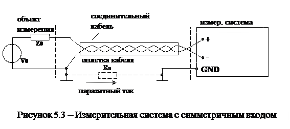 Сопротивление Rд земляной шины достигает 0,1 Ом/м и напряжение, созданное блуждающими токами, будет включено последовательно с измеряемым напряжением V0. Чтобы избежать этого включения необходимо строго следовать правилу единственной точки заземления. Еще лучшие результаты обеспечивает измерительная система с симметричным входом относительно земли (Рис.5.3), когда входной каскад выполняется по дифференциальной схеме.