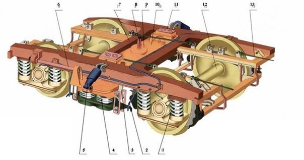 Колесная пара Скользун Надрессорная балка Подпятник Шкворень Рама тележки Поводок Гидравлический гаситель колебаний Центральное рессорное подвешивание Подвеска Скоба предохранительная Буксовое подвешивание Тормозная рычажная передача с 2-сторонним нажатием колодок Колесная пара Рама тележки 3.- 4. Рессорное подвешивание (3 -центральное, 4 -буксовое)