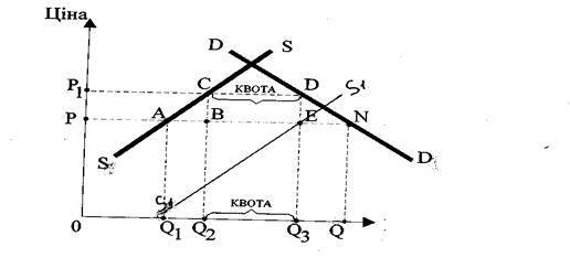 Допустим, что страна вначале проводит политику фридредерства во внешней торговле. Представим, что цена на данный товар составляет ОР и национальные покупатели готовы купить и потребить ОQ товара: в том числе у национальных товаропроизводителей ОQ1, а Q1Q – у импортеров. С развитием товарного производства и рынка развитые страны перешли к политике протекционизма, используя такой ее инструмент, как таможенная пошлина, которая включается в цену и после реализации товара автоматически поступает в госбюджет. В результате цена импортных товаров повышается на величину таможеной пошлины с ОР до ОР1. При росте цены спрос уменшается с ОQ до ОQ2. Для национальных производителей создаются условия для повышения цены товара до уровня (немного ниже) импортной. И так как их цена ниже импортной, они с части рынка выталкивают импортеров и захватывают ее. В результате национальное производство увеличивается с ОQ1 до ОQ2, а импорт уменьшается с Q1О до Q3Q2, то есть импортеры потеряли часть рынка в данной стране Q1Q2 и Q3Q. Более всего пострадали национальные покупатели, так как они после введения ТП платили цену за товар не ОР, а ОР1. Их потери составили РР1DE. Доход РР1CB поступил национальным производителям, а доход ВСDЕ – в госбюджет. Кроме того, импортеры потеряли сумму дохода АВС, которую присвоили национальные производители (восполнимые потери), а ЕКN в связи с уменьшением спроса потеряли не только импортеры, главное – это чистые потери общества.Если импортеры потеряли часть своей выручки (АВС и ЕКN), то они на эту сумму меньше купят товаров в данной стране. Квоты бывают: глобальные или импортные, которые фиксируют объем импорта определенного количества товаров за год или в течение другого периода времени, но не указывают детальные позиции импортируемого товара или страну. Экспортные квоты – предназначаются для уменьшения вывоза сырья, с целью его переработки на месте или в связи с сокращением спроса на международном рынке, или в борьбе против монополистов и т. д.. Квота принципиально отличается от таможенной пошлины: 1. квота – это административный метод регулирования, а таможенная пошлина – рыночный механизм, который корректирует объем МТ; 2. ТП автоматически поступают в государственный бюджет, а квота – органам, занимающимся квотированием и лицензированием. Последствия введения квоты для национальной экономики и МТ: