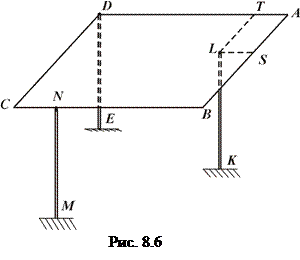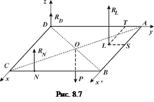 Розв’язання. Згідно з аксіомою про в’язі, звільнюємо платформу від в'язів, замінивши дії опор їх реакціями. Оскільки опори вертикальні, а платформа займає горизонтальне положення, то всі реакції Вага Введемо декартову систему координат з центром в точці