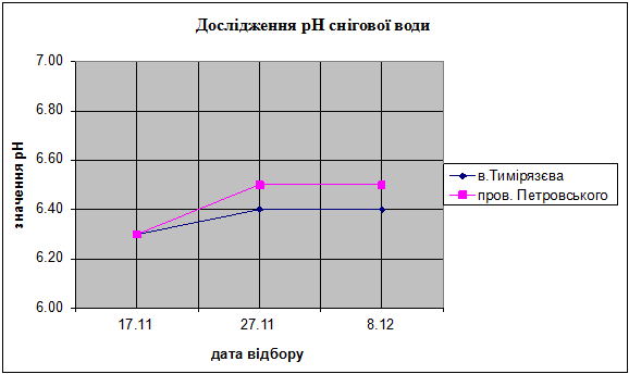В ході роботи були досліджені 6 зразків дощової та 6 зразків снігової води. Збір трьох з них проводився в районі будинку № 3 по вулиці Тімірязєва (район машбуду). Інші три зразки збирались за адресою провулок Петровського будинок 4 (центр міста). рН середовища визначалось за допомогою рН-метра “рН-150”. За результатами дослідень було з’ясовано, що дані зразки води мають слабокисле, близьке до нейтрального середовище. Це пов”язано з тим, що в м.Сміла немає нафтопереробних та металургійних виробництв, які призводять до викидів сульфур та нітроген діоксидів в атмосферу, які збільшують кислотність опадів.