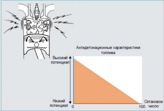Октановое число является одной из характеристик бензина, оно указывает антидетонационные свойства бензина. Бензин с более высоким октановым числом менее склонен к детонации при сгорании в двигателе по сравнению с бензином, обладающим низким октановым числом. Для повышения октанового числа в некоторые сорта бензина добавляют свинец, другие сорта бензина, не содержащие свинца, называют неэтилированными. Так как некоторые двигатели предназначены для использования этилированного бензина, а другие — неэтилированного, следует обращать на это внимание и использовать только соответствующий тип бензина. УКАЗАНИЕ: Детонация возникает в результате ненормального (взрывного) сгорания бензина в цилиндре двигателя. Признаком детонации является резкий повторяющийся металлический стук в стенки цилиндра, при детонационном сгорании полезная мощность двигателя снижается.