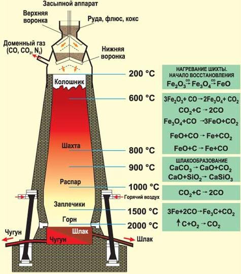 Рис. 1.3 Доменная печь. В дальнейшем железо науглероживается, образуя при температуре свыше 1200°С жидкий чугун, состоящий из цементита Fe3C, феррита Fe и графита С, с общим содержанием углерода 2,5..4,2%. Аналогичные процессы протекают с примесями пустой породы (марганец, кремний, фосфор, сера и другие), приводящие к образованию шлака. В нижней части горна после накопления порции чугуна и шлака её систематически выпускают через лётку чугуна: чугун в чугуновозы, а шлак в шлаковозы или в отделение грануляции. До 96% потребляют конвертера сталеплавильных цехов, а остальное отправляют в отделение разливки чугуна для получения чушек для последующего использования их в производстве литых деталей. В результате протекания окислительно-восстановительных процессов в печи образуется колошниковый газ, содержащий до 35% СО, 8% СО2, 2% H2, 55% N2 и использующийся для нагрева заготовок в методических печах, воздуха в воздухонагревателях и в других целях.