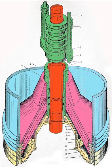 Вращение воронки распределителя в процессе приема и высыпания шихты приводит к улучшению использования энергии восстановительных газов, сокращению удельного расхода кокса и повышению производительности печи. Для получения равномерного окружного распределения шихты при скиповой ее подаче, характеризующейся неравномерностью поступления шихты в загрузочное устройство, необходимо, чтобы при любом положении воронки шихта высыпалась из ее выгрузочного отверстия полным сечением. Диаметр выпускного отверстия принимают равным 600—700 мм. Выполнение распределителя с промежуточной вращающейся воронкой упрощает его конструкцию и обслуживание, повышает надежность этого узла. Продолжительность работы малого конуса можно увеличить до двух лет если малый конус и его воронку оборудовать съемными кольцами (рис.4.4). В этом случае после износа контактирующих колец их вырезают, а в работу вступают следующая пара колец.