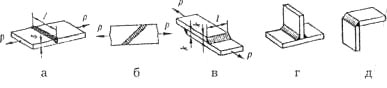 Рис. 1.3. Сварные швы Заклепочные соединения. В случаях когда невозможно применять самый дешевый способ соединения сваркой, детали соединяют специальным элементом — заклепкой (рис. 1.4). Заклепка — стержень цилиндрической формы 2 с закладной головкой 1, которая может быть различной формы: полусферической (а), потайной (б), полупотайной (в) и плоскоконической (г). Заклепки изготавливаются из алюминия, меди, их сплавов, реже из стали. Размеры заклепок и их форма стандартизированы. Для соединения деталей в них просверливаются сквозные отверстия; отверстия совмещают и снизу вставляют заклепку, под которую устанавливают поддержку. На выступающий конец заклепки воздействуют обжимкой (молотком, кувалдой), в результате чего конец превращается в замыкающую головку 3, а заклепка становится короче, но толще, заполняя пространство между деталями. Расположенные в ряд заклепки образуют заклепочные швы, которые по назначению бывают: прочные, плотные и прочно-плотные. При соединении деталей встык применяют одну или две накладки (рис. 1.4, д), которые располагают над или под соединяемыми деталями.