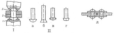 Рис. 1.4. Заклепки: I — заклепочное соединение, II — виды заклепок Посадка с натягом применяется значительно реже, чем сварные и заклепочные соединения. Для этого одну из соединяемых деталей со сквозным отверстием или углублением нагревают до высокой температуры, при этом диаметр отверстия увеличивается, деталь натягивают на другую. При остывании отверстие принимает первоначальный размер и происходит жесткое соединение деталей. При необходимости аналогичным образом детали можно рассоединить. Клеевые соединения. В последнее время промышленность стала выпускать новые виды клея, способного скреплять различные материалы: дерево с металлом, пластик с металлом, металлы с металлами и т. п. Новые виды клея позволяют соединяемым деталям выдерживать определенные нагрузки, что расширяет возможности использования клеевых соединений в машиностроении.