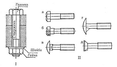 Рис. 1.5. Болты: I - соединение с помощью болта; II — виды болтов Гайкой называется деталь различной формы со сквозным отверстием и внутренней резьбой (рис. 1.6). Наиболее часто применяются гайки шестигранной (а, б), реже — квадратной и круглой /в, г) формы. Гайки, которые завинчиваются "от руки" (гайки-барашки), бывают открытые и закрытые (д, е). Иногда при вибрациях и динамических нагрузках происходит самовывинчивание гаек. Для предотвращения этого и увеличения силы трения применяют гаечный замок — вплотную к основной гайке 2 навинчивают контргайку 1 (рис. 1.6, ж) или используют пружинные шайбы, имеющие срез, загнутые концы которого предотвращают самовывинчивание.