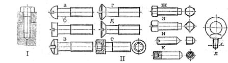 Рис. 1.7. Винты: I - соединение с помощью винта, II — виды винтов Шпилька — цилиндрический стержень с резьбой на обоих концах. При соединении с помощью шпильки можно получать как болтовое соединение (реже), так и соединение винтом. Если в обеих деталях имеются сквозные отверстия, то в совмещенные отверстия вставляется шпилька, а на выступающие концы стержня с двух сторон навинчиваются гайки. Если в одной из деталей есть резьбовое углубление, то в него до отказа завинчивается один конец шпильки, на стержень надевается вторая деталь, а затем на свободный конец шпильки навинчивается гайка (рис. 1.8). Для разборки соединения достаточно отвинтить гайку и удалить деталь, а шпильку можно не выворачивать. Соединения с помощью шпилек более надежны, чем соединения винтом, а в некоторых случаях и надежнее, чем болтом. Клиновые соединения. В соединениях данного типа для скрепления деталей используется клин, представляющий собой пластинку, ограниченную параллельными или непараллельными плоскостями (рис. 1.9, а). Для скрепления деталей в них проделываются соответствующей формы отверстия, затем отверстия совмещают и вставляют клин. Если у клина параллельные плоскости, то он вставляется и вынимается свободно и соединение называется ненапряженным. В напряженных клиновых соединениях (рис. 1.9, б) боковые стороны клина непараллельны, клин вставляют в пазы скрепляемых деталей и заколачивают. Благодаря малому углу между боковыми сторонами клин надежно удерживается в пазах деталей силой трения.