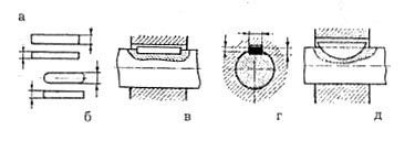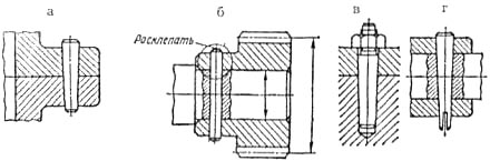 Рис. 1.8. Шпилька Рис. 1.9. Клиновые соединения Штифтовые соединения. Штифт — крепежная деталь цилиндрической или конической формы с головками или без них (рис. 1.10). Для соединения в деталях просверливаются сквозные отверстия (например, на валу и в детали), отверстия совмещают и в них вставляют штифт. Штифтовые соединения бывают напряженными fa) и ненапряженными (б, в). Иногда конец штифта снабжается пропилом и разводится после монтажа, а при необходимости демонтажа усики пропила сводятся и штифт легко удаляется (г). Конические штифты бывают с резьбой на конце (в) или без нее fa). Штифты устанавливаются перпендикулярно оси вала.