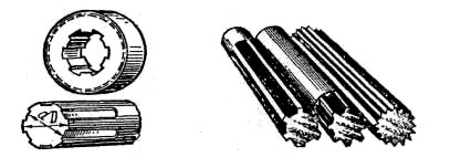 Рис. 1.12. Шлицевые соединения Профильные соединения. Свое название они получили в связи с тем, что соединяемые с валом детали имеют отверстия, по форме соответствующие профилю конца вала (квадратный, треугольный и т. д.). Таким образом крепятся ножи мясорубок на валу, рукоятки на конце вала, вал сменного механизма с валом универсального привода и т. п. Преимущества и недостатки профильных соединений аналогичны шлицевым соединениям.
