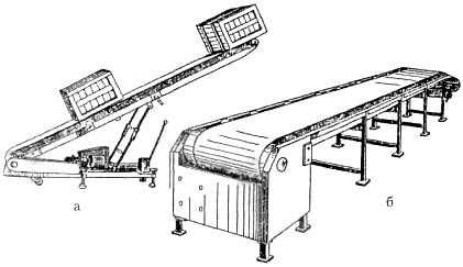 Оборудование данного типа предназначено для транспортировки грузов в горизонтальном и наклонном направлениях. На предприятиях общественного питания они используются в складской группе помещений. Транспортеры — машины непрерывного действия с гибким тяговым органом, который осуществляет перемещение груза таким образом, что последний остается неподвижным относительного тянущего участка тягового органа. К машинам с гибким тяговым органом относятся ленточные, пластинчатые и скребковые транспортеры (конвейеры), а также элеваторы и подъемники непрерывного действия. В зависимости от направления перемещения груза транспортеры делятся на горизонтальные, наклонные и с переменным наклоном (переменным углом подъема груза). Элеваторы бывают наклонные (как правило, с большим углом наклона) и вертикальные. Транспортеры выпускаются стационарные и передвижные (с колесами для перемещения в нерабочем состоянии). Конвейер наклонный передвижной складывающийся КНПС-4 с переменным углом наклона (рис. 11.1, а). Предназначен для перемещения затаренных грузов под углами от 12 до 37°. Стрела транспортера шарнирно соединена с тележкой, на которой установлен электропривод. Наклон стрелы изменяется с помощью гидропривода. В нерабочем состоянии стрела конвейера, состоящая из двух частей, может складываться. Стационарный ленточный горизонтальный конвейер КЛ-1 с плоской лентой (рис. 11.1, б) предназначен для перемещения затаренных грузов. Рама конвейера секционирована. Крайними секциями его служат приводная станция с реверсивным электроприводом и натяжная с винтовым натяжным устройством. Длина транспортера может меняться за счет изменения числа средних секций.