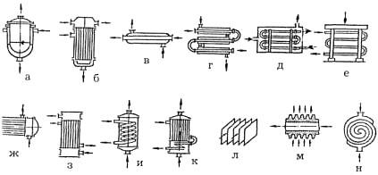 Теплообменным аппаратом называется устройство, в котором происходит передача тепла от одного теплоносителя к другому. Каждый теплообменный аппарат должен обеспечивать передачу требуемого количества тепла, при этом один теплоноситель нагревается, а другой — охлаждается. Теплообменные аппараты можно классифицировать по следующим признакам: по способу передачи тепла от одного теплоносителя к другому различают теплообменные аппараты поверхностного типа (пищеварочные котлы, жаровни с косвенным обогревом и др.) и теплообменники смешения, т.е. непосредственного соприкосновения (пароварочные шкафы); по виду теплоносителя различают парожидкостные Теплообменные аппараты (теплообмен через стенку между паром и жидкостью происходит во всех аппаратах с паровым обогревом); жидкостно-жидкостные, когда оба теплоносителя являются жидкостями, и газожидкостные. К последним относятся газовые и огневые кипятильники; по расположению поверхности нагрева — на рубашечные, кожухотрубные, элементные однокорпусные, элементные многокорпусные, погружные, оросительные (рис. 14.1, а—е); по конфигурации поверхности нагрева — на трубчатые горизонтальные, вертикально-кожухотрубные, змеевиковые, комбинированные, пластинчатые, ребристые, спиральные (рис. 14.1, ж—н). В тепловой аппаратуре предприятий общественного питания наиболее распространены теплообменные аппараты поверхностного типа, в которых тепло от одного теплоносителя к другому передается через разделительную стенку. Поверхность, через которую передается тепло, называется поверхностью нагрева теплообменного аппарата.