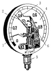 Рис. 15.5. Электроконтактный манометр: 1 — контактная стрелка нижнего предела давления; 2 — манометрическая стрелка; 3 — контактная стрелка верхнего предела давления; 4 — шкала определения давления (кГ/см2); 5 — соединительный штуцер; 6 — гнездо для переводного ключа Датчик-реле давления РД-4. Относится к регулирующим приборам и состоит из чувствительного элемента — мембраны и контактной группы микропереключателя. Резиновая мембрана закреплена между корпусом и крышкой. Давление к чувствительному элементу подается снизу. Противодействие ему создает пружина, сжатие которой производят регулировочным винтом. Чем больше сжата пружина, тем при большем давлении произойдет переключение контактов микропереключателя, на кнопку которого усилие передается от мембраны через золотник и рычаг. Для защиты от повреждений и загрязнений реле закрыто крышкой (колпаком). Укрепляется реле с помощью кронштейна. Реле уровня. Регулирование уровня воды и некоторых других жидкостей можно осуществлять по следующей схеме. Для этого один вывод вторичной обмотки разделительного трансформатора подсоединяют к металлическому корпусу резервуара, а другой — к обмотке реле уровня. Вторую клемму обмотки реле уровня подсоединяют к электроду, введенному в резервуар через изоляционную втулку. Когда электрод находится в воде, цепь обмотки реле замкнута. Размыкающий контакт отключает обмотку магнитного пускателя и поступление воды прекращается. После понижения уровня воды ниже электрода цепь обмотки реле размыкается. Обмотка реле отключается, а обмотка магнитного пускателя включается. Контакты пускателя включают двигатель насоса или соленоидный вентиль подачи воды. При повышении уровня воды до электрода насос или соленоидный вентиль отключается. Электрическое реле уровня применяется и для защиты тэнов от "сухого хода", т. е. для отключения электронагревателей при понижении уровня воды и оголении тэнов в оборудовании. При отсутствии воды (на воздухе) такие тэны быстро нагреваются до очень высокой температуры и выходят из строя. Вопросы для самоконтроля 1.Сформулируйте, в чем заключается преимущество использования электрических нагревательных элементов? 2.Опишите устройство тэна. 3.Дайте определение понятию “сухой ход”. 4.Назовите приборы контроля и управления электротепловыми аппаратами.