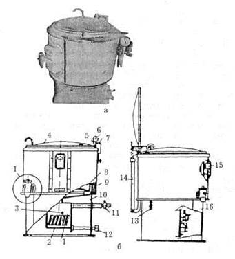 Рис. 17.4. Котел пищеварочный электрический КПЭ-100-1М: а — общий вид; б — разрез: 1 — трубчатые электронагреватели; 2 — парогенератор; 3 — термобаллон; 4 — крышка; 5 — воронка; 6 — манометр; 7 — предохранительный клапан; 8 — варочный сосуд; 9 — обечайка; 10 — основание; 11 — пробно-спускной кран; 12 — пробка; 13 — наливной кран; 14 — пружинный противовес; 15 — реле давления; 16 — датчик-реле температуры Принцип действия. Работа котла предусматривает три Режима: 1 — "Варка", 2 — "Разогрев", 3 — "Варка на пару". Первый режим ("Варка"). Котел включается на полную мощность тэнов. О включении котла сигнализирует зеленая лампа "Включено" на станции управления. Об автоматическом выключении котла из-за срабатывания защиты "сухого хода" сигнализирует красная лампа "Нет воды". После включения котла и загорании зеленой лампы "Включено" растет давление в пароводяной рубашке. Образующийся при этом пар поднимается вверх и вытесняет воздух, который выходит через принудительно открытый предохранительный клапан 7. Ручка предохранительного клапана повернута стрелкой вверх. Как только температура содержимого варочного котла достигнет 80—85 °С, пар начинает выходить через открытый предохранительный клапан. В этом случае нужно ручку предохранительного клапана повернуть стрелкой вниз и прекратить выход пара. Давление пара в пароводяной рубашке начнет возрастать и через некоторое время достигнет верхнего заданного предела (0,035 МПа), а температура внутри варочного сосуда примерно 95°С. При этом реле давления переключит котел на 1/8 мощности тэнов и будет поддерживать режим тихого кипения. Если давление пара в пароводяной рубашке будет падать и достигнет нижнего предела 0,005 МПа, реле давления вновь переключит тэны на полную мощность. Второй режим ("Разогрев"). Котел включается на полную мощность. При достижении давления в пароводяной рубашке верхнего предела (0,035 МПа) содержимое варочного сосуда закипает, а реле давления выключает тэны. Третий режим ("Варка на пару"). Котел включается на полную мощность, и при достижении давления пара в пароводяной рубашке верхнего заданного предела (0,035 МПа) вода в варочном сосуде закипает, а реле давления переключает тэны на 1/8 мощности. Если давление продолжает падать и достигает нижнего установленного предела, реле давления переключает тэны на 1/2 мощности. При достижении верхнего заданного предела реле давления вновь переключает тэны на 1/8 мощности и так цикл будет повторяться до тех пор, пока не произойдет выключение котла. Котлы КПЭ-160-1М и КПЭ-250-1М отличаются от котла КПЭ-100-1М не только размерами варочного сосуда, мощностью тэнов, габаритами и массой, но и теплотехническими показателями. В режиме нагрева воды от 10 до 100°С наибольший КПД у котла КПЭ-160-1М (88,6%), у котла КПЭ-250-1М он равен 87,3%, а наиболее низкий у котла КПЭ-100-1М — 83,8%. Различные значения КПД свидетельствуют о том, что на нагрев 1 дм3 воды расходуется различное количество энергии (кВт • ч). Так, у котла КПЭ-160-1М этот показатель равен 0,118 кВт-ч/дм3;, у котла КПЭ-250-1М — 0,120, а у котла КПЭ-100-1М — 0,125 кВт-ч/дм3. Коэффициент теплопередачи через стенку варочного котла для всех котлов находится в пределах от 320 до 350 Вт/(м2 • К).