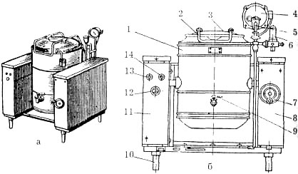 Рис. 17.8. Электрический секционный модульный котел КПЭСМ-60М: а — общий вид; б — схема котла: 1 — котел; 2 — фиксатор крышки; 3 — крышка; 4 — манометр; 5 — заливная воронка; 6 — двойной предохранительный клапан; 7 — маховик; 8, 11 — тумбы; 9 — сливной кран; 10 — ножки; 12 — переключатель; 13, 14 — сигнальные лампы. Вода в котел подается из колонки водоснабжения с помощью поворотного крана. В левой тумбе установлена панель с электроаппаратурой. На лицевую сторону выведены: сигнальные лампы "Вкл" 13 и "Нет воды" 14 и переключатель 12 для установки режима работы котла. Принцип работы. Котел работает в двух режимах. В первом режиме котел работает сначала на полной мощности, а после повышения давления в рубашке до заданного верхнего предела переключается на слабый нагрев (1/9 мощности). После понижения давления до нижнего заданного предела котел вновь включается на полную мощность. Этот режим работы используется при варке супов, борщей и других первых блюд. Во втором режиме котел работает на полной мощности до тех пор, пока давление в рубашке не достигнет верхнего заданного предела. После этого нагреватели котла полностью отключаются. Довариваются продукты за счет аккумулированного тепла без расхода электроэнергии. Второй режим используется при кипячении молока, варке киселей, овощей. Электрические котлы КПЭ-40 и КПЭ-60 (рис. 17.9) устанавливаются на чугунной вилкообразной станине 10 с помощью двух полых цапф 8 и 16, соединенных с наружным кожухом котла 15. Поворотный механизм 9 имеет то же устройство, что и у котла КПЭСМ-60М. Для заполнения варочного сосуда 1 водой к левой стойке станины с внешней стороны прикреплена водопроводная труба 17, снабженная вентилем 18, водоразборным патрубком 20 и кронштейном 19 для подвешивания крышки. Варочный котел с установленным на нем снаружи обтекателем 2 закрывается легкосъемной крышкой 3. Крышка имеет ручку в центре и стальной крючок с внутренней стороны, с помощью которого ее вешают на кронштейн. К арматуре котла относятся установленные на арматурной стойке 7 электроконтактный манометр 4, двойной предохранительный клапан 6, наполнительная воронка 5 и кран уровня 11. Пар вырабатывается в нижней части рубашки с помощью трех тэнов 13, смонтированных на съемном днище 14 котла. Котел снабжен болтом заземления 12.