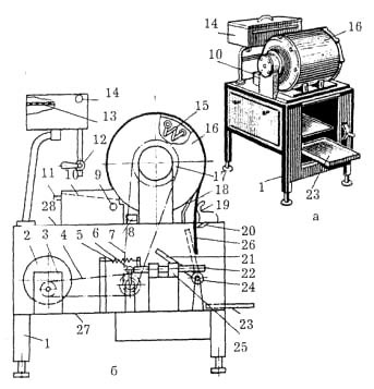 Рис. 18.8. Вращающаяся электрическая жаровня ВЖШЭ-675: а — общий вид; б — схема: 1 — ножки; 2 — электродвигатель; 3 — червячный редуктор, 4, 7 — цепные передачи; 5 — пружина; 6 — ролик, 8 — поддон, 9 — патрубок, 10 — лоток, 11 — патрубок; 12 — кран; 13 — сетка; 14 — бачок; 15 — тэны; 16 — барабан, 17, 25 — подшипники; 18 — скребковый нож; 19 — направляющая; 20 — нож; 21 — отсекатель; 22 — рейка; 23 — полка, 24 — зубчатое колесо; 26 — блинная лента; 27 — нижний стол; 28 — верхний стол Для непрерывной подачи теста на барабан на кронштейнах установлен бачок 14 с крышкой, фильтрующей сеткой 13 и пробковым краном 12 для подачи теста на лоток 10. Для поддержания вязкости теста в определенных пределах тесто охлаждают водой. Вода в лоток подается через патрубок 11 с помощью шланга, а отводится в канализацию через патрубок 9. Под лотком находится корытообразный поддон 8. От поверхности барабана блинная лента 26 отделяется скребковым ножом 18 и, опускаясь вниз, проходит между ножом 18 и направляющими 19. С помощью отсекателя 21, совершающего колебательное движение, и ножа 20 отрезается заготовка. Движение отсекателя вокруг оси совершается под действием толкающего ролика 6. При вращении водила вокруг оси по часовой стрелке ролик нажимает на рейку 22, при перемещении которой в подшипниках 25 вращательное движение получает зубчатое колесо 24 и отсекатель 21, закрепленные на одном валу. После отрезания порции от блинной ленты ролик прекращает нажимать на рейку и пружина 5 с большой скоростью возвращает рейку и отсекатель, снабженный противовесом, в исходное положение. Блинчики с помощью отсекателя укладывают в стопку на выдвижном листе 23. Техническая характеристика жаровни ВЖШЭ-675 представлена в табл. 18.10. Таблица 18.10 Технические характеристики жаровень