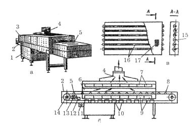 Рис. 18.9. Конвейерная печь ПКЖ: а — общий вид; б — схема; в — блок ИК-генераторов: I — пульт управления; 2 — стол загрузки; 3 — боковая теплоизоляционная панель; 4 — вентиляционно-фильтрующее устройство; 5 — конвейер; 6 — жарочная камера; 7,9 — блоки верхних и нижних генераторов; 8 — стол загрузки; 10 — штепсельная розетка; 11 — реле времени; 12 — электродвигатель; 13 — редуктор; 14 — ведущий вал конвейера; 15 — рефлектор; 16 — ИК-генераторы; 17 — металлическая сетка Торцевые панели со стороны загрузки и выгрузки противней имеют окна для их прохода. ИК-излучатели мощностью по 0,75 кВт, собранные в блоки по 6 шт., изготовлены в виде хромоникелевой спирали, помещенной в кварцевую трубку. Со стороны противней ИК-излучатели защищены металлической сеткой, исключающей попадание стекла на продукт. Блоки легко вынимаются через боковые дверцы. Температура спиралей нагревателей достигает 900—1000 С, поэтому сверху продукты обогреваются за счет лучистой энергии, а снизу — путем контакта с нагретыми противнями. Наряду с излучением тепло продукту передается конвекцией от нагретого воздуха камеры. Пары и газы из камеры удаляются с помощью вентиляционного устройства через патрубок, шибер и далее в вентиляционную систему. Принцип действия. Цепной конвейер приводится в движение электродвигателем через червячный редуктор. Загрузка противней производится со стороны приемной ветви конвейера. Входящая ветвь конвейера выполняет роль загрузочного стола. Ветвь конвейера, которая проходит через жарочную камеру, называется рабочей, при этом продукт находится между верхними и нижними нагревателями. На каждый блок нагревателей предусмотрена своя трехфазная штепсельная розетка. В печи 13 блоков нагревателей: внизу — семь, а в верху — шесть. Мощность ИК-излучателей одного блока — 4,5 кВт. Общая мощность всех ИК-излучателей составляет 58,5 кВт. Конвейер имеет прерывистое движение, т.е. его движение чередуется с остановкой. Скорость движения конвейера постоянна и составляет 0,01 м/с, а интервал между включениями конвейера зависит от продолжительности тепловой обработки, выбираемой с помощью реле времени. При очередном включении конвейера он проходит расстояние, равное ширине противня, а затем останавливается. Всего за весь цикл тепловой обработки конвейер делает десять остановок. Если продукт на выходе не обладает нужными органолептическими свойствами, то с помощью реле увеличивают время его тепловой обработки. Правила эксплуатации печи. Учитывая мощные тепловые потоки ИК-излучателей и быстрый прогрев изделий, во избежание пригорания продукта противни смазывают жиром. Затем укладывают на них изделия и устанавливают в приемную ветвь конвейера. Открывают шибер и включают вытяжную вентиляцию. Тумблер режима работы конвейера устанавливают в положение "Автомат", с помощью реле времени выбирают продолжительность жарки и включают кнопку нагревателей печи. Через 3 мин двигатель конвейера автоматически включается, и противни начинают перемещаться в жарочную камеру. При укладке противней на конвейер необходимо контролировать их плотное прижатие друг к другу, так как в случае промежутков между ними будет происходить пригорание изделий, и защита отключит блоки нагревателей. При продвижении противней по конвейеру блоки нагревателей включаются на 3—4 мин раньше, чем к 