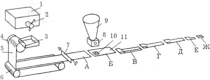 Машина МБН-780 предназначена для приготовления блинчиков с начинкой. Устанавливается на комбинатах питания и кулинарных фабриках. На машине выполняются следующие операции: выпечка непрерывной тестовой ленты, разрезание ее на отдельные заготовки, их охлаждение, дозирование начинки, завертывание блинчиков, группировка по 30 шт. (5 рядов по 6 шт.) на подпергаментной подложке. Машина скомплектована в виде стационарного блока приготовления блинчиков и подвижного транспортера выдачи. Блок приготовления блинчиков включает бак для теста, питающий лоток, жарочный барабан, транспортер охлаждения, отрезное устройство, бункер начинки с питателем, дозатор начинки, транспортер завертки с шестью съемными каретками, группировочный транспортер, съемник, блок электрооборудования и пульт управления. Все устройства блока работают от общего главного привода. На рис. 18.10 изображена технологическая схема приготовления блинчиков (без их группировки). Жидкое тесто подается из бака 1 автоматически открываемым краном 2 на лоток 3, охлаждаемый водой. Уровень теста в баке поддерживается автоматически поплавковым устройством. С лотка тесто поступает на поверхность вращающегося барабана 4 жаровни ЖВЭ-720, внутри которого смонтированы электронагреватели, выпекается и сходит с барабана в виде непрерывной тестовой ленты 5. Транспортер охлаждения 6 обеспечивает охлаждение тестовой ленты воздухом с обеих сторон и передает ее на транспортер завертки. Отрезное устройство 7 отделяет от тестовой ленты заготовку 11 (позиция А). Дозатор 8, пополняемый питателем 9, выдает дозу начинки 10 на заготовку 11 (позиция Б). Затем заготовка перемещается на стол, оборудованный завертывающим механизмом. Сначала происходит завертывание левой и правой продольных полос (позиции В и Г), а затем трехкратное поперечное складывание блинчика (позиции Д, Е, Ж).