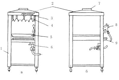 К специализированным относятся аппараты и устройства для опаливания птицы и дичи, пассерования и припускания овощей и т. д. Устройство УОП-1 для опаливания птицы и дичи (рис. 19.5) работает на газовом обогреве и служит для опаливания кур, цыплят, рябчиков, тетеревов и т. д. на предприятиях общественного питания. Устройство состоит из рамы 1, закрытой с трех сторон облицовками. Сверху к раме крепится крышка 2, в которой предусмотрено отверстие для подключения к вытяжной вентиляции 7. В центре крышки установлен поворотный диск 3, к которому крепятся восемь крюков 4 для закрепления тушек. В средней части рамы имеется выдвижной поддон 9 для сбора отходов при опаливании. На правой передней стойке рамы имеются кронштейны для установки опалочной горелки 8 и запальника 5. Горелка с помощью гибкого шланга соединяется с блоком автоматики безопасности 6 типа АБ.