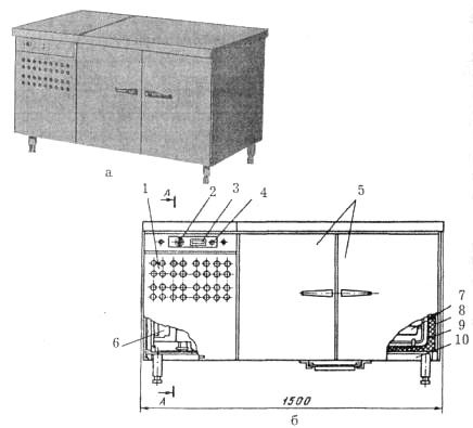 Рис. 24.13. Прилавок холодильный закрытый ПХС/В-1-0,25: а — общий вид, б — схема, 1 — ограждение машинного отделения, 2 — тумблер, 3 — термометр; 4 — сигнальная лампа, 5 — двери, 6 — холодильный агрегат; 7 — функциональная емкость, 8 — наружная облицовка; 9 — внутренняя облицовка; 10 — рама Охлаждаемая витрина ВХС/В-1-0,08 (рис. 24.14) имеет теплоизолированный короб, ограничивающий охлаждаемый объем снизу и сбоку (в месте расположения испарителя). С трех сторон витрины устроено двойное остекление. Со стороны продавца находятся раздвижные створки. В витрине могут разместиться три функциональные емкости размером в плане 325x530 мм. Под витриной расположен встроенный холодильный агрегат ВС 400 (2).