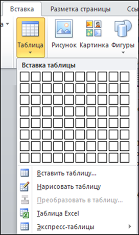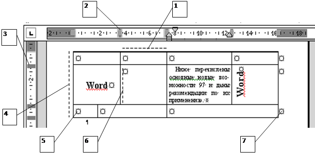 Рис. 1. Основные элементы таблицы, где 1 – область выделения столбца (указатель мыши – ê), 2 – маркер границы столбца (указатель мыши – Ö), 3 – маркер границы строки (указатель мыши – ×), 4 – область выделения строки таблицы (указатель мыши – ö) 5 – маркер ячейки, 6 – область выделения ячейки (указатель мыши – ö), 7 – маркер строки таблицы. Создание таблиц Создать таблицу можно различными способами: Ø с помощью мыши, Ø с помощью команды Вставить таблицу; Ø с помощью команды Нарисовать таблицу. Для выбора соответствующей команды используется список кнопки Таблица в области Таблица вкладки Вставка (рис. 2).