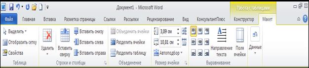 Рис. 3. Лента дополнительной вкладки Макет при работе с таблицами