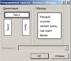 1. Поместить курсор в нужную ячейку таблицы. 2. Выбрать команду Направление текста… изконтекстного меню или одноименную кнопку на вкладке Макет. 3. В появившемся диалоговом окне (или щелкая по кнопке) выбрать нужную ориентацию содержимого ячейки (рис. 5).