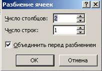 1. Выделить ячейки, которые требуется разбить. 2. Выбрать команду Разделить ячейки из контекстного меню или соответствующую кнопку на вкладке Макет и в диалоговом окне задать необходимые параметры(рис. 6).