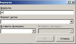 Выполнение вычислений в таблице В ячейках таблицы Word можно выполнять арифметические вычисления над данными, использовать для расчетов функции и задавать различные форматы представления результата. Ввод формулы, выбор функций и задание форматов для результата выполняется в диалоговом окне Формула, которое вызывается командой Формула из списка кнопки Данные вкладки Макет (рис. 8). После изменения данных результат вычислений автоматически не изменяется. Его требуется пересчитать. Для этого нужно выделить формулу в ячейке и нажать клавишу F9. Например, необходимопросуммировать содержимое ячеек. Для этого следует: 1. Установить курсор в той ячейке, в которую должна быть помещена сумма. 2. 3. В появившемся окне (рис. 9) в поле Формула ввести функцию суммирования.