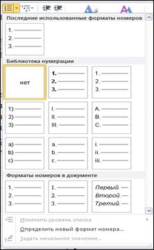 С помощью пунктов Определить новый маркер и Определить новый формат номера можно подобрать собственный маркер или нумерацию, изменить расстояние между маркером и текстом, изменить расстояние от поля до списка, снять с выделенных абзацев статус списка.