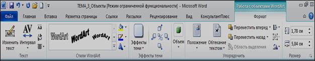 Рис. 19. Панель дополнительной вкладки Формат Форматирование графического объекта предполагает изменение цвета объекта (заливка), его тени или объема, цвета границы объекта (линии, обозначающие его контур), толщины и типа линии и др.
