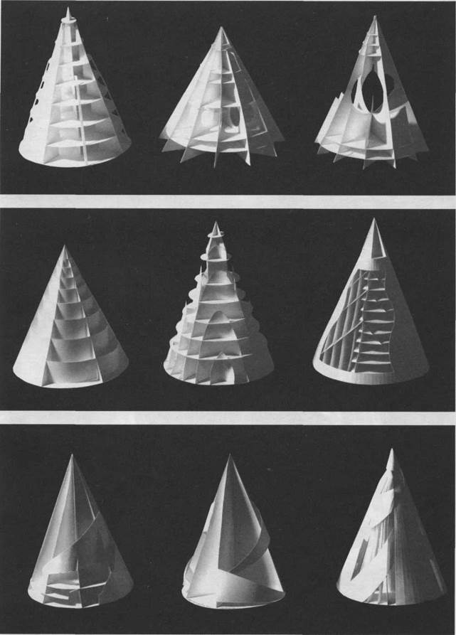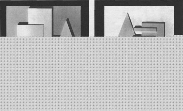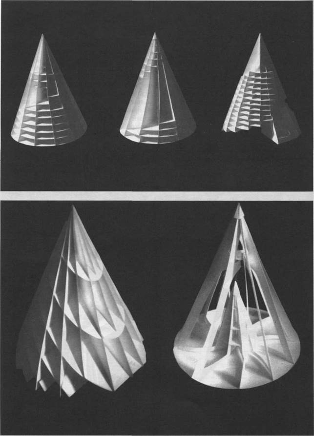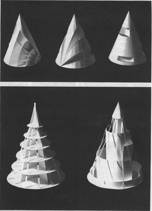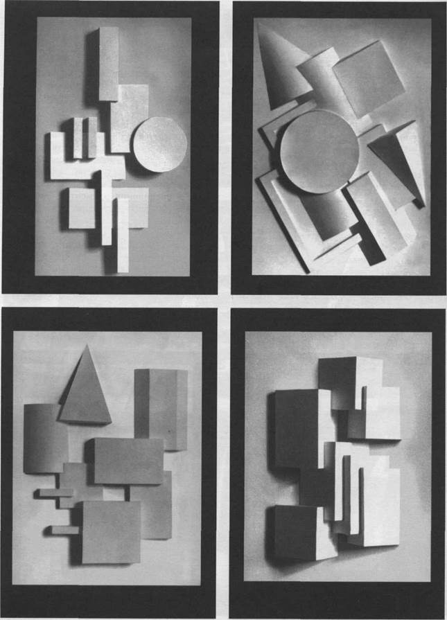 На вступительных экзаменах в некоторые ЗАДАНИЕ 18. Фронтальная композиция из простых геометрических элементов. цель: Ознакомиться с основными понятиями и принципами построения фронтальной композиции. задачи: Освоить принцип выполнения макета из сложных выкроек. требования: Выполнить фронтальную композицию в виде макета-рельефа на вертикальной плоскости из простых геометрических фигур. Для композиции использовать простые геометрические фигуры, врезанные друг в друга (куб, призма, цилиндр, конус и т. д.). Количество элементов от 5 до 9 (ил. 72—74). МЕТОДИЧЕСКИЕ УКАЗАНИЯ: Композиция должна быть уравновешенной, в ней должна передаваться пространственная очередность расположения фигур и прослеживаться первоначальная форма каждого элемента. Высота рельефа задается автором. порядок выполнения: Делаются тоновые наброски композиции, потом маленький черновой (рабочий) макет, на котором проверяется правильность композиционного замысла и соединения элементов, делаются поправки. По рабочему макету выполняются выкройки отдельных элементов для основного макета. На этом задании происходит освоение основных навыков выполнения сложных выкроек, предусматривающих врезку, стыковку и склеивание отдельных элементов и соединение их не только между собой, но и с поверхностью основания.