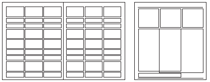 Рис. 13. Модульные сетки для рекламных изданий Не следует путать модульную сетку с типографской сеткой, определяющей размеры полей и формат полосы набора. Конечно, модульная сетка, постольку, поскольку имеет дело с печатными изданиями, должна учитывать размеры строк, высоту литер, пробельные элементы в типографских мерах (квадраты, цицеро, пункты), чтобы правильно располагать печатный материал на странице. Система сеток благодаря четкой модульной основе позволяет ввести в процесс проектирования издания электронные программы. В прикладной, промышленной графике модульную сетку применяют при конструировании всевозможных рекламных издании и, в особенности при проектировании графического фирменного стиля. Модульную сетку применяют при конструировании различных знаков, знаков визуальных коммуникаций, товарных знаков и др.
