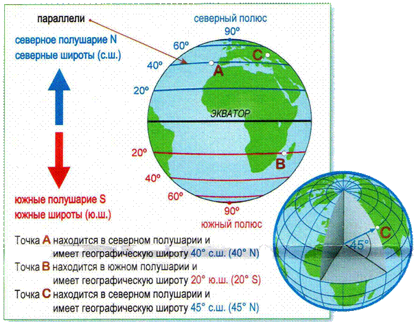 Как определить географическую широту Географическая широта показывает расстояние от экватора до заданной точки, выраженное в градусах. Географическая широта бывает северной и южной. У всех точек, расположенных в северном полушарии – северная широта (с.ш.), а в южном полушарии – южная широта (ю.ш.). Для определения географической широты на карте или на глобусе изображены параллели – линии, проведённые параллельно экватору.