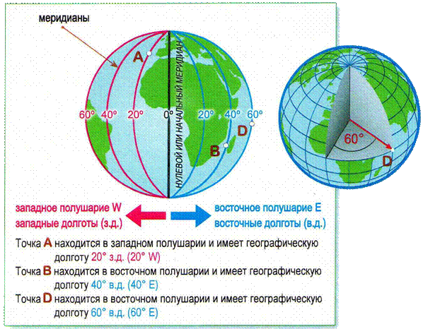 Географическая долгота показывает расстояние от нулевого меридиана (Гринвича) до заданной точки, выраженное в градусах. Географическая долгота бывает западной и восточной.