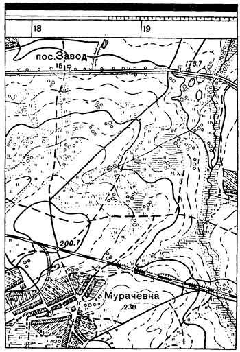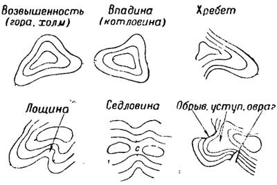 Рис.163. Изображение горизонталями основных видов рельефа Все точки местности, через которые проходит рассматриваемая горизонталь, находятся выше (или ниже) точек, через которые проходит соседняя горизонталь, на 5, 10 метров, - в зависимости от величины сечения. (2) Читать карту – это значит правильно и полно воспринимать символику ее условных знаков, быстро и безошибочно распознавая по ним не только тип и разновидности изображаемых объектов, но и их характерные свойства. Изучение местности по карте (чтение карты) включает определение общего ее характера, количественных и качественных характеристик отдельных элементов (местных предметов и форм рельефа), а также определение степени влияния данной местности на организацию и ведение боя. Изучая местность по карте, следует помнить, что со времени ее создания на местности могли произойти изменения, которые не отражены на карте, т. е. содержание карты в какой-то мере не будет соответствовать действительному состоянию местности на данный момент. Поэтому изучение местности по карте рекомендуется начинать с ознакомления с самой картой. Ознакомление с картой. При ознакомлении с картой по сведениям, помещенным в зарамочном оформлении, определяют масштаб, высоту сечения рельефа и время создания карты. Данные о масштабе и высоте сечения рельефа позволят установить степень подробности изображения на данной карте местных предметов, форм и деталей рельефа. Зная величину масштаба, можно быстрее определять размеры местных предметов или удаление их друг от друга. Сведения о времени создания карты дадут возможность предварительно определить соответствие содержания карты действительному состоянию местности. Затем читают и по возможности запоминают величины склонения магнитной стрелки, поправки направления. Зная на память поправку направления, можно быстрее делать перевод дирекционных углов в магнитные азимуты или ориентировать карту на местности по линии километровой сетки. Общие правила и последовательность изучения местности по карте. Последовательность и степень подробности изучения местности определяется конкретными условиями боевой обстановки, характером боевой задачи подразделения, а также сезонными условиями и тактико-техническими данными боевой техники, применяемой при выполнении поставленной боевой задачи. При организации обороны в городе важное значение имеет определение характера его планировки и застройки, выявление прочных зданий с подвальными помещениями и подземных сооружений. В том случае, когда по городу проходит маршрут движения подразделения, изучать с такой подробностью особенности города нет необходимости. При организации наступления в горах основными объектами изучения являются перевалы, горные проходы, теснины и ущелья с прилегающими к ним высотами, формы скатов и их влияние на организацию системы огня. Изучение местности, как правило, начинают с определения ее общего характера, а затем детально изучают отдельные местные предметы, формы и детали рельефа, их влияние на условия наблюдения, маскировки, проходимость, защитные свойства, условия ведения огня и ориентирования. Определение общего характера местности имеет целью выявление важнейших особенностей рельефа и местных предметов, оказывающих существенное влияние на выполнение поставленн