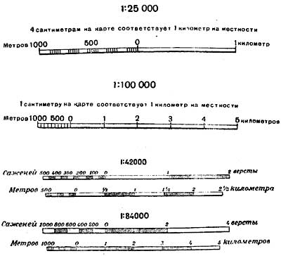 Рис.161. Линейные и численные масштабы При его помощи расстояния можно измерять так: скопируй на бумажку линейный масштаб, приложи ее к измеряемой линии и отсчитай расстояние. Вместо бумажки можно пользоваться спичкой, травинкой и т. н.