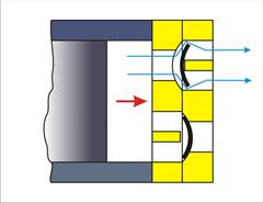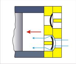 При неработающем компрессоре его поршни неподвижны, пластины всасывающего и нагнетательного клапанов занимают свободное (вертикальное) положение. При работе компрессора работу каждого цилиндра можно разделить на два такта — всасывания и нагнетания. При всасывании воздуха в цилиндр объем под поршнем увеличивается и пластины всасывающего клапана, прижимаясь к упорному бурту, прогибаются и пропускают воздух в цилиндр. В это же время пластины нагнетательного клапана, также прогибаясь, еще более плотно прижимается к седлу, тем самым исключая попадание воздуха из нагнетательного патрубка обратно в компрессор. При нагнетании воздуха объем под поршнем уменьшается — происходит сжатие — на рис. это соответствует движению поршня вправо. Упругое усилие пластины нагнетательного клапана рассчитано так, что она начинает отгибаться от седла, когда давление в цилиндре становится равным расчетному давлению нагнетания — при этом уже пластины всасывающих клапанов оказываются плотно прижаты к своим седлам. Таким образом, действие пластин нагнетательного клапана аналогично действию пластин всасывающего клапана.